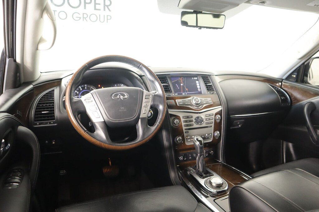 THIS VEHICLE COMES EQUIPPED WITH THE FOLLOWING OPTIONS AND FEATURES: Deluxe Technology Package (Adaptive Front Lighting System, Advanced Climate Control System, Bose Cabin Surround Sound System, Chrome Mirror Caps, Climate-Controlled Front Seats, Espresso/Charcoal Burl Trim, Front Pre-Crash Seatbelts, Headlight Washers, Hydraulic Body Motion Control System, Semi-Aniline Leather-Appointed Seating w/Quilting, and Smart Rear View Mirror (SRVM)), Driver Assistance Package (Backup Collision Intervention (BCI), Blind Spot Intervention (BSI), Blind Spot Warning, Intelligent Cruise Control (Full-Speed Range), and Lane Departure Warning System), Theater Package (120V Power Outlet, Dual 8" Color Monitors, Heated 2nd-Row Seats, and Wireless Headphones (2)), Tire & Wheel Package (Wheels: 22" x 8.0" 14-Spoke Forged Aluminum-Alloy), 13 Speakers, Auto High-beam Headlights, Heated Front Bucket Seats, Heated front seats, Leather-Appointed Seats w/Stratford Burl Trim, Navigation System, Power Liftgate, Power moonroof, Radio: AM/FM/HD Single In-Dash CD/DVD Player w/MP3, 2.94 Axle Ratio, 3rd row seats: split-bench, 4-Wheel Disc Brakes, ABS brakes, Air Conditioning, Alloy wheels, AM/FM radio: SiriusXM, Anti-whiplash front head restraints, Auto tilt-away steering wheel, Auto-dimming door mirrors, Auto-dimming Rear-View mirror, Auto-leveling suspension, Automatic temperature control, Brake assist, Bumpers: body-color, Carpeted Cargo Mat/Cargo Net & First Aid Kit, CD player, Delay-off headlights, Driver door bin, Driver vanity mirror, Dual front impact airbags, Dual front side impact airbags, Electronic Stability Control, Emergency communication system: INFINITI Connection, Four wheel independent suspension, Front anti-roll bar, Front Bucket Seats, Front Center Armrest, Front dual zone A/C, Front fog lights, Front reading lights, Fully automatic headlights, Garage door transmitter: HomeLink, Genuine wood console insert, Genuine wood dashboard insert, Genuine wood door panel insert, Heated door mirrors, Heated steering wheel, Illuminated entry, INFINITI Radiant Illuminated Kick Plates, Leather Shift Knob, Leather steering wheel, Low tire pressure warning, Memory seat, Occupant sensing airbag, Outside temperature display, Overhead airbag, Overhead console, Panic alarm, Passenger door bin, Passenger vanity mirror, Power door mirrors, Power driver seat, Power passenger seat, Power steering, Power windows, Radio data system, Rain sensing wipers, Rear air conditioning, Rear anti-roll bar, Rear audio controls, Rear reading lights, Rear seat center armrest, Rear window defroster, Rear window wiper, Reclining 3rd row seat, Remote keyless entry, Roof rack: rails only, Roof Rail Crossbars, Security system, Speed control, Speed-sensing steering, Split folding rear seat, Spoiler, Steering wheel