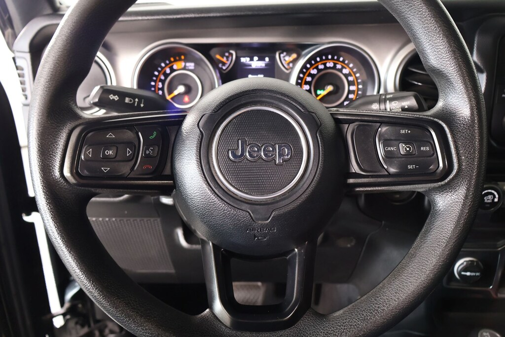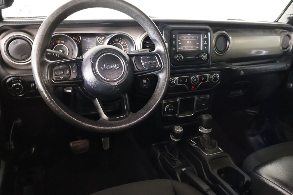 Bluetooth, Apple CarPlay, Android Auto, Back Up Camera, Wrangler Unlimited Sport, 4D Sport Utility, 2.0L I4 DOHC, 8-Speed Automatic, 4WD, Black Clearcoat, Black Cloth, 1-Year SiriusXM Radio Service, 3.45 Rear Axle Ratio, 4-Wheel Disc Brakes, 8 Speakers, ABS brakes, Air Conditioning, AM/FM radio, Aux Battery, Brake assist, Cloth Low-Back Bucket Seats, Compass, Deep Tint Sunscreen Windows, Delay-off headlights, Driver door bin, Driver vanity mirror, Dual front impact airbags, Dual front side impact airbags, Electronic Stability Control, Front anti-roll bar, Front Bucket Seats, Front Center Armrest w/Storage, Front fog lights, Front reading lights, Integrated roll-over protection, Integrated Voice Command w/Bluetooth, Low tire pressure warning, Non-Lock Fuel Cap w/o Discriminator, Normal Duty Suspension, Occupant sensing airbag, Outside temperature display, ParkView Rear Back-Up Camera, Passenger door bin, Passenger vanity mirror, Power steering, Quick Order Package 22B Sport, Radio data system, Radio: Uconnect 3 w/5" Display, Rear anti-roll bar, Rear reading lights, SiriusXM Satellite Radio, Speed control, Split folding rear seat, Steering wheel mounted audio controls, Stop-Start Dual Battery System, Tachometer, Telescoping steering wheel, Tilt steering wheel, Traction control, Trip computer, Variably intermittent wipers, Wheels: 17" x 7.5" Black Steel Styled.